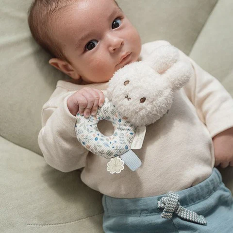 C’est miffy et elle fait du bruit ! Chaque fois que vous bougez miffy, vos efforts sont récompensés par un son de cliquetis. Le hochet en forme d’anneau est décoré avec l’imprimé Lucky Leaves de Little Dutch et peut être facilement saisi par de petites mains d’enfants. Il y a 3 petites étiquettes sur le hochet à explorer et au-dessus un amical miffy pour jouer avec.