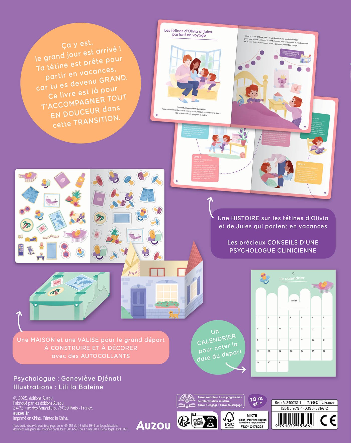 Dans ce livre, les enfants sont accompagnés étape par étape pour arrêter l’utilisation de la tétine. Tout est organisé autour de la tétine qui part en vacances: les enfants lisent l’histoire de Jules et Olivia qui doivent dire au revoir à leur tétine. Comme eux, les enfants prennent le calendrier (fournis) et notent la date du départ avec les parents. Ils construisent ensuite une maison à décorer avec des autocollants (tous les deux fournis) pour y déposer la tétine en journée. Ensuite l’enfant construit la valise (fournie avec des autocollants pour la décorer) pour la mettre dedans le jour J et la remettre à ses parents. Avec les précieux conseils d’une psychologue clinicienne pour accompagner le parent dans cette importante étape!