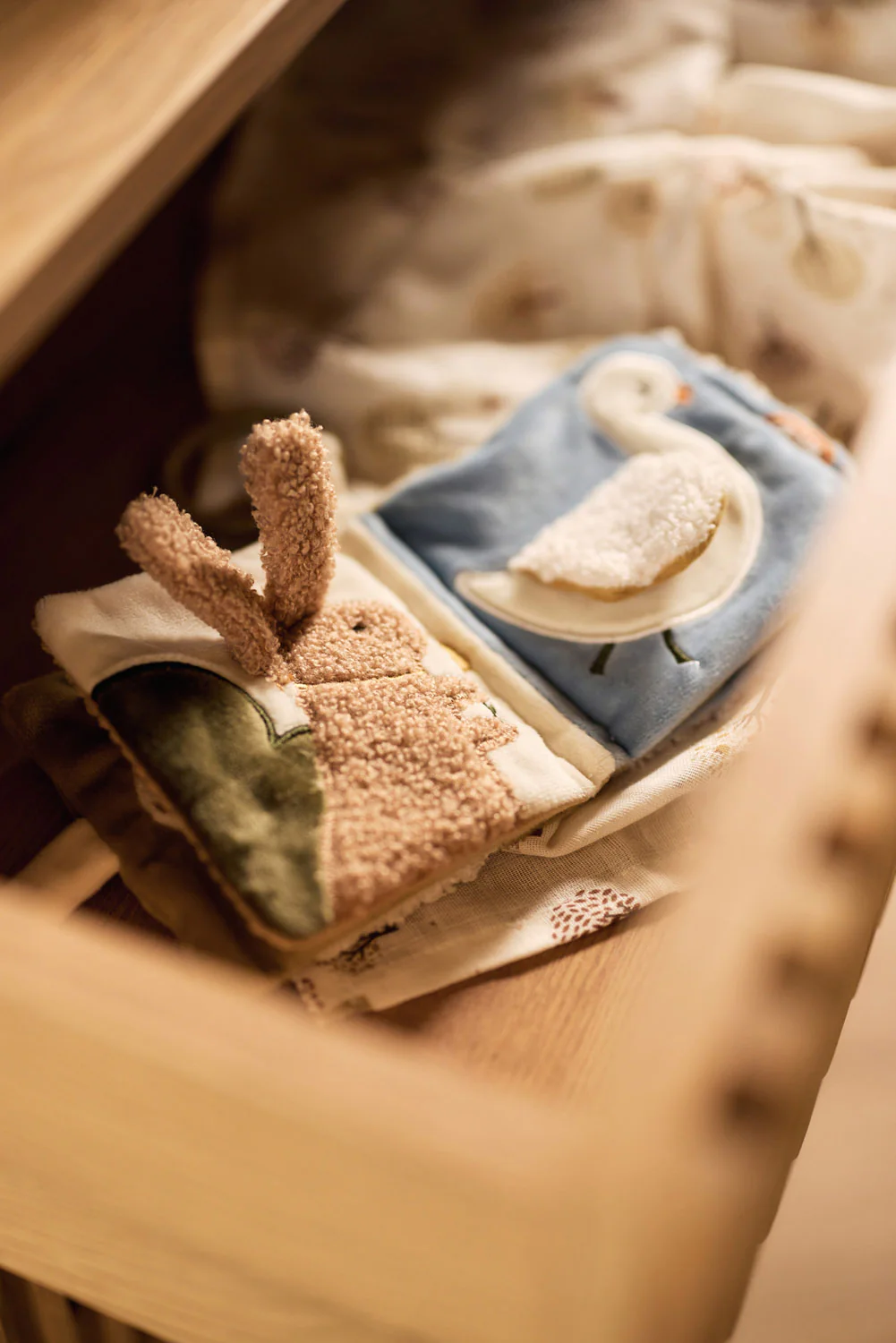 Ce petit livre d’activités doux de la collection Tiny Park est spécialement conçu pour stimuler les sens de votre bébé. Il se compose de quatre pages, chacune illustrée d’un adorable animal : un lapin, un oiseau, un canard ou un cygne. Les pages sont remplies de matières bruissantes qui invitent à la découverte et au jeu. Un petit miroir et des arbres décorent les pages pour plus de plaisir. Un jouet parfait pour stimuler les sens et la motricité de votre tout-petit !
