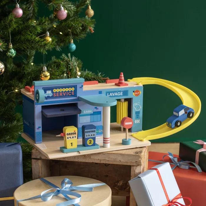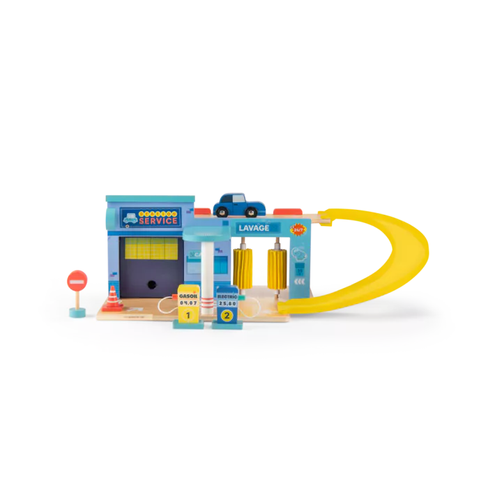 Faire le plein, laver les voitures, réparer les pannes, les petits s’inventeront d’incroyables histoires avec la station-service en bois. Cette station au look rétro comprend 1 voiture, 1 rampe, 2 pompes, 1 box…pour des heures de jeu en perspective !