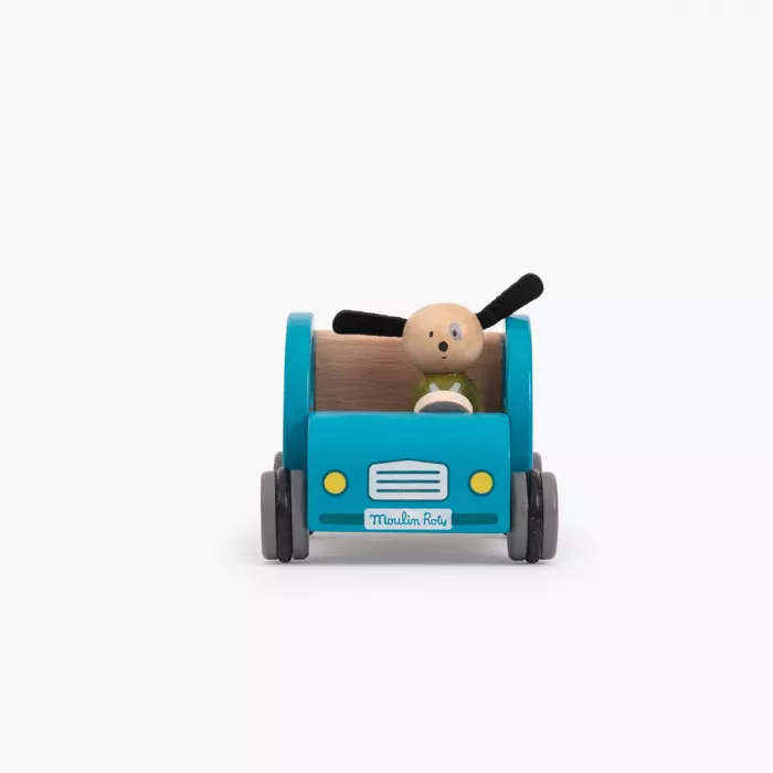 Julius part en week-end au volant de sa belle voiture décapotable ! Elle est en bois sérigraphié avec un coffre ouvrable pour y ranger sa valise. La voiture week-end peut être associée à la caravane de la même collection !